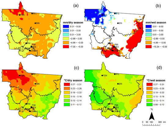 ERA-5 precipitation trend per dry (a) and wet (b) season and temperature trend per dry (c) and wet (d) season for the last 40 years for the state of Mato Grosso. White space means non-significant trends.