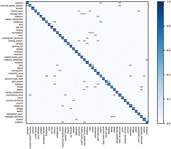 - Evaluation Criteria. Overall accuracy (OA) aims to evaluate the performance of the classifiers on the testing dataset. It is formulated as the number of correctly classified images divided by the whole number of testing images. OA is the most used criterion for measuring the effectivity of the methods for RSI scene classification. Thus, we also use the OA as our evaluation criteria for all experiments. In addition, we also adopt the confusion matrix table in the ablation study to show the detailed classification results, which visualizes the accuracy of each class.