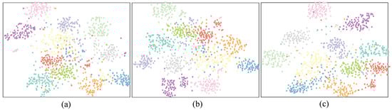- Visualization. To demonstrate the effectiveness of the proposed method, we further visualize the features extracted from our method using the t-SNE algorithm [44]. We employ the t-SNE algorithm to embed high-dimensional features into two-dimensional space. It is convenient for us to measure the superiority of our approach by inspecting the derived clusters from the outputs of t-SNE.