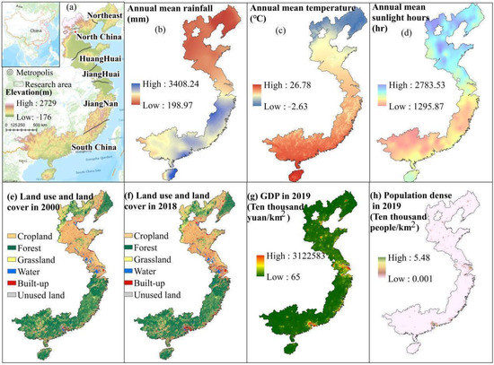 The daily temperature, precipitation, and sunlight hours data with 1 km resolution, covering 2000 to 2019, were derived from the China Meteorological Data Sharing Service Network, China Ground Climate Daily Data Set (V3.0) (http://cdc.cma.gov.cn, accessed on 1 May 2021). This dataset does not include weather stations in Hong Kong, Macau, and Taiwan provinces. After strict quality control, the dataset is significantly improved in terms of the quality and integrity of the same data type; the correct rate is close to 100%. As for the time range of studies, due to data limitations, many studies have been carried out to 2015 or even earlier [55,56], and just a few studies have been conducted in the last 20 years [57,58]. We have extended the data to the recent 20 years in our research.