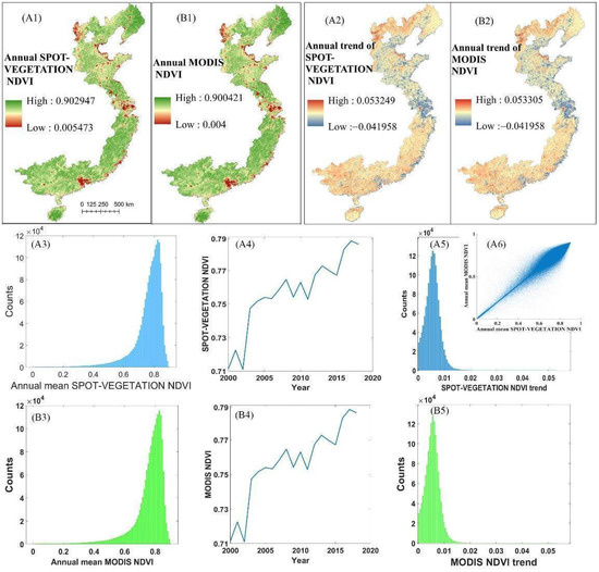 Spatio-temporal pattern and heterogeneity of vegetation dynamics. (A1) represents the annual SPOT-VEGETATION NDVI from 2000–2019; (B1) shows the annual MODIS NDVI from 2000–2019; (A2) represents the annual trend of SPOT-VEGETATION NDVI; (B2) represents the annual trend of MODIS NDVI; (A3) shows frequency distribution histogram for A1; (B3) shows frequency distribution histogram for B1; (A4) shows annual changes of SPOT-VEGETATION NDVI across entire coastal China from 2000 to 2019; (B4) shows annual changes of MODIS NDVI across entire coastal China from 2000 to 2019; (A5) is the frequency distribution histogram for A2; (B5) is the frequency distribution histogram for B2; and (A6) shows the scatter plot of annual mean SOPT-VEGETATION NDVI against MODIS NDVI in pixel scale.