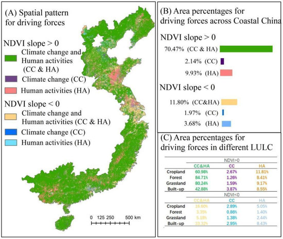 Anthropogenic causes are not easy to be quantified since the statistical data are rare and incomplete. Many studies did not mention what the specific human activities were, nor did they quantify such impacts at the landscape scale. Thus, we explicitly quantify several human-induced drivers to the vegetation dynamics along coastal China. For the regions with reduced NDVI, the driving force is mainly the combined effect of climate change and human activities (Figure 3A), and human activities have a greater impact (Figure 4B2). The negative effects of human activities may mainly hinge on (i) urban expansion or (ii) land reclamation. First, for urban expansion, many studies supported our assumption that with the rapid economic development in coastal China, the rapidly growing population stimulates the ever-increasing demands on urban land, occupying the surrounding high-quality farmland, grassland, or forest, removing native vegetation and replacing it with an impervious water surface, ultimately reducing NDVI [81,82]. Second, as to the reason for cropland reclamation, native vegetation, such as grassland or woodland, tends to be more productive in wet and warm coastal China, and when converted to cropland, productivity might be reduced [83,84,85].