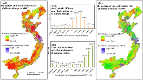 In the perspective of human activities, the area with a positive effect to NDVI accounted for 80.37%; the area is relatively large where the contribution rate of human activities is in the range of +60~+100%, mainly distributed in the northeast region, Huanghuai region, and south China region. Adversely, NDVI in 15.47% of the region, the Yangtze River Delta in particular, has negative feedback with human activities (Figure 4(B1,B2)).