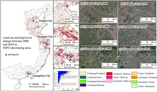 At the landscape scale, land-use change can reflect well the transformation of natural land cover by human activities. First, through the analysis of land-use conversion from 2000 to 2018, it is found that in the areas with reduced NDVI, 21% of cultivated land is converted to construction land, and 4.21% of forest land is converted to construction land. However, the proportion of cultivated land is very small (Figure 5). Second, the Euclidean distance from the impervious surface is further calculated to represent the disturbance ability of human activities. It is found that with the attenuation of human disturbance, the decline of the NDVI’s decreasing rates is in logarithmic form, and the disturbance intensity may drop to 0 at about 40 km (Figure 5d).