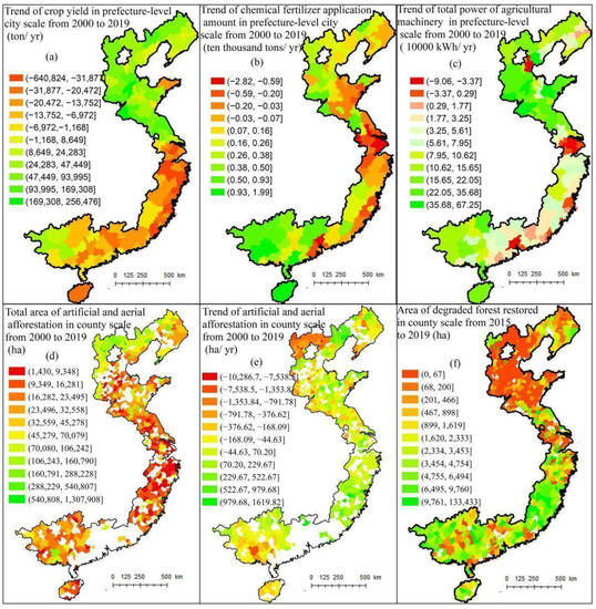 Based on the statistical yearbook data, the spatial and temporal patterns of crop yield, fertilizer application amount, and total power of agricultural machinery in coastal areas are analyzed. In the northern region, especially in the North China Plain, crop yield has increased in the last 20 years (Figure 6a), but fertilizer application has decreased, especially in central Shandong province (Figure 6b). Simultaneously, total power of agricultural machinery continued to increase, except in Tianjin, the Yangtze River Delta, and the Pearl River Delta (Figure 6c). The construction of irrigation and water conservancy facilities makes the change of NDVI strongly depend on irrigation and less dependent on precipitation. The results showed that the improvement of agricultural management practices was beneficial to the increase of crop yield and vegetation greenness. The spatial pattern of afforestation in coastal areas from 2000 to 2019 was also drawn. It is found that the area with the largest total area of afforestation was located in the northern part of the North China Plain, around the Beijing–Tianjin–Hebei region (Figure 6d), which was the promotion of the projects named ‘Beijing–Tianjin–Hebei Sandstorm Source Area Control’ and ‘Green for Grain’ [72,73,74]. The afforestation area in southeast China showed an increasing trend (Figure 5e). Besides, the “Restoration Projects of Degraded Forests” in the recent five years were also mainly carried out in the southeast regions of coastal China (Figure 5f).