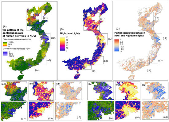 Residual trend analysis shows that human activities harmed NDVI in the Bohai Rim, Yangtze River Delta, and Pearl River Delta (Figure 7a1–a4). Through the nighttime light data, the vigorous light intensity in these areas reflected frequent human activities (Figure 7b1–b4). Further analysis by the partial correlation between nighttime lights and NDVI showed a strong negative correlation (Figure 5c1–c4). Similar results obtained by these two methods indicated the reliability of the residual trend analysis.