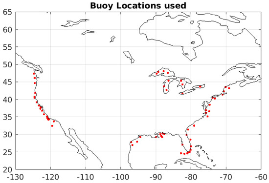 For validation we use National Data Buoy Center (NDBC) data—we use only buoys that are within 100 km of coastline. In Figure 1 we plot all the buoy locations used in the analysis presented in this paper. We use 178 NDBC buoys, and we have about 1.7 million matchups with version 4.1 of QuikSCAT, 1.46 million matchups for V3.1, and 1.4 million matchups for V3. Finally, we use the Liu and Tang model [31] to convert the buoy measurements to 10 meter equivalent neutral winds.