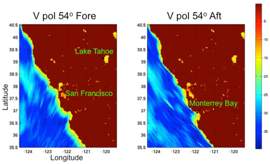 The input dataset for the coastal reprocessing is the version 2 QuikSCAT Level 1B data using the slice normalized radar cross-section () (https://doi.org/10.5067/QSXXX-L1B02, accessed on 9 July 2020), and we obtain this data from the Physical Oceanography Active Archive Center (PODAAC) at JPL. is the calibrated radar cross section, which is proportional to the received power, and normalized by gain, area, and range factors. The distance to nearest coastline map is obtained from Goddard Space Flight Center and is posted every 0.01° in latitude and longitude (https://oceancolor.gsfc.nasa.gov/docs/distfromcoast/, accessed on 9 July 2020). We then improve the distance from coast map by including major inland seas (Caspian sea), as well as many of the largest lakes in the world. For the land mask, we use the 24-category Land Cover and Land Use maps from the United States Geological Survey (USGS) which is posted at 30 arcsecond resolution (https://www.usgs.gov/centers/eros/science/usgs-eros-archive-land-cover-products-global-land-cover-characterization-glcc, accessed on 10 March 2022). To compute the spatial response of the radar on the ground we use the antenna pattern for QuikSCAT as well as knowledge of the slice bandwidth and chirp rate of the radar.