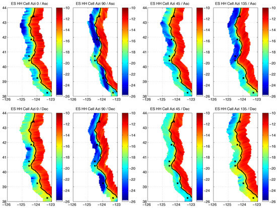 We have computed ES, as a lookup table , where are the latitude and longitude from the 10 years of QuikSCAT data itself. To do this we loop over all of the orbits of QuikSCAT, and for each slice we compute the total spatial response, as well as that only over land, and accumulate the the sum response over land times the slice , and the total response for all 10 years of QuikSCAT. We accumulate monthly maps of ES into a climatology that allows for seasonal variations that repeat each year. In Figure 5 we show ES for four different antenna azimuth angles off the western coast of the United States. The top row contains ES for HH polarization at 0°, 45°, 90°, and 135° antenna azimuth angle for ascending, and the bottom shows the same for descending. We can clearly see how much ES varies in the coastal region versus antenna azimuth angle and location, it is very important to account for the different viewing geometry as well as location.