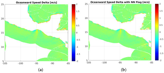 (a) Map of average coastal wind speed bias as compared to that WVC’s oceanward neighbors. (b) Same with data flagged as poor coastal processing by this neural network removed. For each WVC we compute the speed bias versus its less coastal nearest neighbors, then accumulate that difference into this map. The less coastal nearest neighbors are the WVCs which are immediately adjacent to the WVC in question, which are also further from the coastline. We see that some regions have persistent errors, such as the northern shoreline in this sample image. We use a neural-network based flagging algorithm that removes these regions with persistent errors.