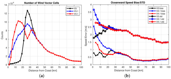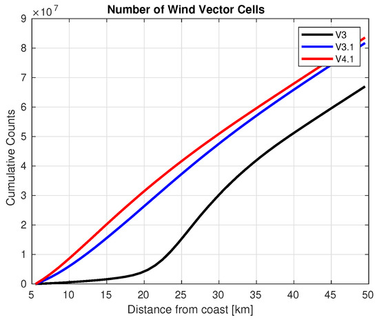 We can quantify the increase in coastal wind vector cells by looking at the cumulative counts ( total number of samples at a distance less than x from the coast) we show in Figure 9. We can see that there are nearly 10× as many wind vector cells within 20 km of coast in V4.1 as compared to version 3, and we are increasing the number of WVCs as compared to V3.1 even as we reduce the speed bias and STD as compared to oceanward neighbors.