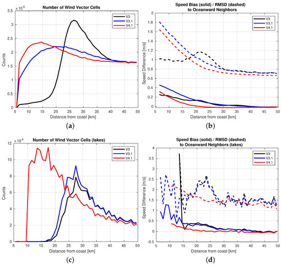 We also considered an alternative method of quantifying the coastal land contamination in a WVC: by comparison to the average of the adjacent WVCs (the adjacent WVCs are the eight nearest neighbors) which are further from the coast. This allows us to see incremental increases in land contamination as we get closer to the coast. In Figure 8 we compare each coastal WVC to the average of its nearest-neighbors which are further away from the coast, then we create statistics as a function of distance from coast. In Figure 8a we show the number of WVCs as a function of distance from coast over ocean, in Figure 8b we plot the speed bias and root-mean-square (RMS) difference as compared to oceanward neighbors, as a function of distance to coast. In Figure 8c,d we plot the same metrics, but over large inland lakes. Again, we first note that the V3 QuikSCAT has very little WVCs closer to the coast than 22.5 km, which has a conservative land rejection threshold. Over ocean, we note that the V3 product sharply drops off in counts around 22.5 km from coast, while V3.1 and V4.1 get much closer to the coast. Over lakes, we find V4.1 gets much closer to the coast than either V3 or V3.1, both of which get no closer than about 22.5 km, while V4.1 gets as close as 10 km to coast. The bias of the V4.1 products is better than that of the V3 and V3.1 products until under 10 km, while the RMS differences are better than V3 at 22.5 km until about 13 km from coast, then about m/s worse at 10 km, and m/s worse as it approaches the lower limit of 5 km from coast. Similarly, over lakes we see that V4.1 has less bias than V3 at 22.5 km while having smaller RMS differences. Note that the same effect is happening in these comparisons as in the buoy comparisons; that is, that the gridding algorithm used causes a bunching effect of the WVC centroids near coastlines, which explains the decrease in WVCs from about 20–40 km and increase below 20 km for the upper-left and lower-left plots in Figure 8.