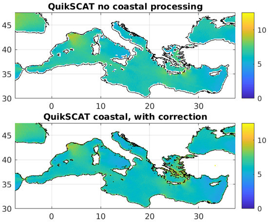 (top) One year of QuikSCAT V3 data over the Mediterranean Sea, which does not include any coastal processing or correction. (bottom) Same for QuikSCAT V4.1. Note the data gap around land is nearly closed, as we retrieve useable winds up to 10 km from land. Overall QuikSCAT V4.1 retrieves about 4 percent more WVCs than version 3 did.
