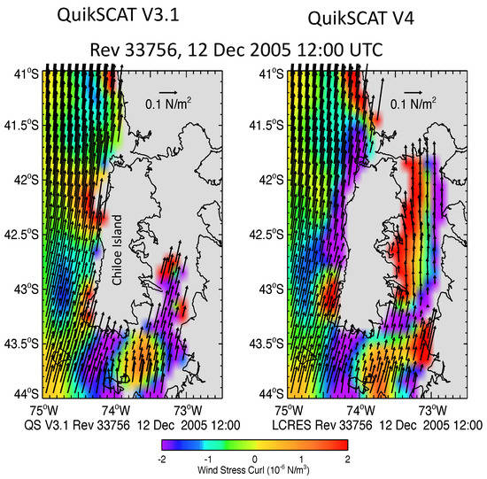 In the analysis of wind forcing of the ocean along southern Chile, Strub et al. [34] were only able to analyze coherent patterns of wind stress and wind stress curl along its west coast and within the inland sea inshore of Chile Island by using version 4.0 of the QuikSCAT processing, with LCRES correction for land contamination. In Figure 11 we show a image of the wind stress curl in this inland sea inshore of Chile island; on the left is the wind stress curl derived using QuikSCAT V3.1 data (with LCR based flag), and on the right is the same using QuikSCAT V4. Even the use of LCR data flagging in the earlier version 3.1 did not reveal realistic patterns of wind stress curl, which are necessary to understand the upwelling that drives high productivity of the marine ecosystem of this region. Globally, V4.1 has about 4% more WVCs with retrievals than V3 had. Finally, the version 4.1 winds are publicly available at https://podaac.jpl.nasa.gov/dataset/QSCAT_LEVEL_2B_OWV_COMP_12_KUSST_LCRES_4.1 (accessed on 16 May 2022).