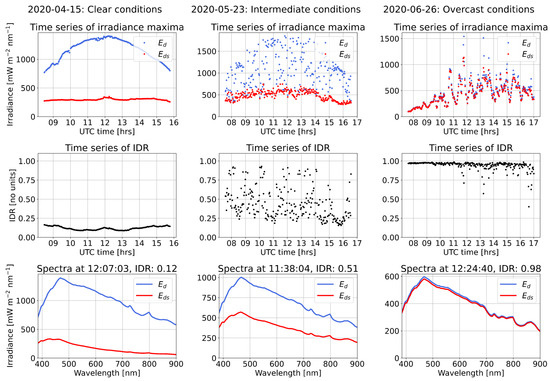 Examples of atmospheric optical state characterization using HSP measurements of , and the IDR, Equation (5). Left column: clear conditions; centre column: intermediate (predominately scattered-cloud) conditions; right column: overcast conditions. The and spectra are filtered using 70 nm Savitzky–Golay filter (Section 2.4). The time series are for solar zenith angle < 60. The date format is YYYY-MM-DD.