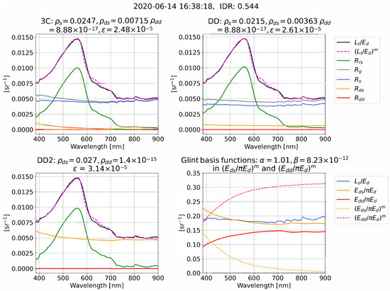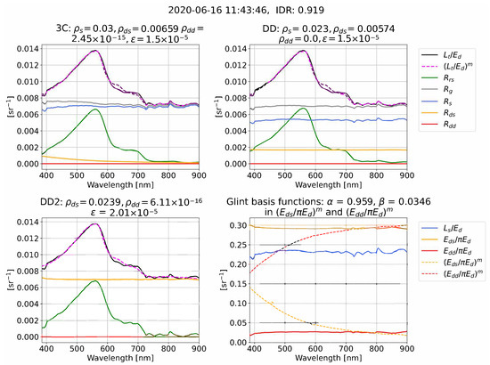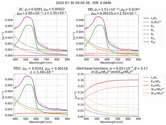 We now give illustrative examples of the reflectance processing and glint corrections for 3C, DD, and DD2 in clear (Figure 4), intermediate (Figure 5), and overcast (Figure 6) conditions. Each example compares measured and model-optimized which define the residual in Equation (11), alongside derived . The examples also illustrate that the algorithms can use very different combinations of the optimized glint components , , and that are used to form for each algorithm (we remind the reader that = 0 in DD2). The measured (, , ) and model-optimized , ) spectral ratios that determine the spectral shape of , , and , Equations (8)–(10), are also shown and are sometimes referred to as “glint basis functions”. It is important to note that Figure 4, Figure 5 and Figure 6 are just a few examples. A statistical range of outcomes are present for algorithm differences in and the optimized glint components , , and , which we characterize as a function of IDR in the results.