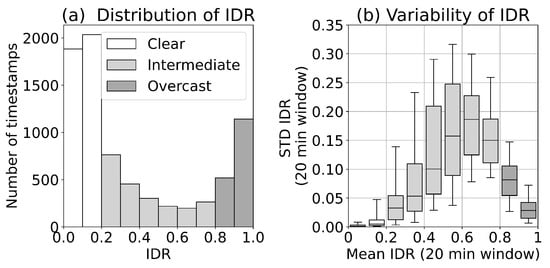 The dependence of IDR variability on the IDR, computed following Section 3.6, is shown in Figure 7b. Clear conditions have the lowest variability in IDR, followed by overcast, with intermediate conditions having the highest variability. Scattered cloud conditions, as shown in Figure 3, are associated with the highest STD IDR. In the analysis of we do not explicitly look at dependencies in terms of IDR variability. However, due to the defined relationships in Figure 7b, an IDR value range can be referenced to a range for IDR variability.