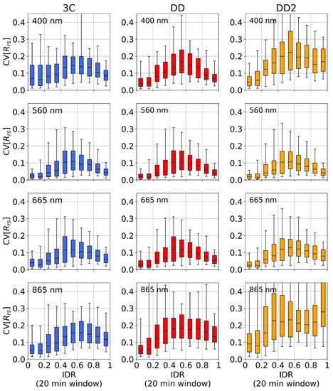 Atmospheric dependence of variability ( computed using a 20 min rolling window). Rows: spectral bands; columns: algorithm variants. The upper and lower box limits notate upper and lower quartiles, the central line indicates the median values, and the whiskers correspond to the 5th and 95th percentiles. The most notable difference in between 3C and DD is the 400 nm band (top row) in clear atmospheric conditions (IDR < 0.2), which are also the most common measurement conditions in the deployment (Figure 7a).