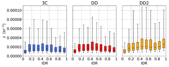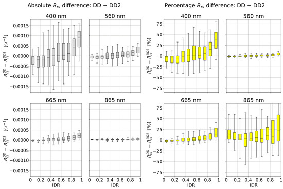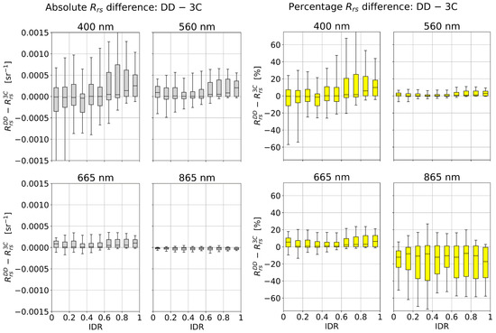 The statistics are assessed at four wavelengths: 400 nm (blue), 560 nm (green), 665 nm (red), and 865 nm (NIR). These are informed by the spectral bands of multispectral satellite radiometers and are called “bands” in the analysis. The dependence of on the IDR is shown for 3C, DD, and DD2 in Figure 8. In the data description we compare 3C and DD (assessment of difference between model-optimized or measured irradiance ratios in the glint correction), or between DD and DD2 (assessment of the effect of removing the sky radiance sensor).
