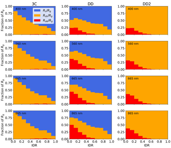 In general, the magnitude of increases with IDR. Therefore, to standardize the IDR dependence of the glint corrections across all conditions, we consider the glint-component fractions , , and . These are shown for the three algorithms in the four spectral bands in Figure 11. Across all four bands, 3C and DD have an increase in with IDR. is very small (<1%) for 3C across all IDR values. and are of comparable magnitude in clear conditions for DD, but in overcast conditions, the contribution of is negligible. In clear conditions, both and are used in the DD2 glint correction, whereas in overcast conditions, only is used. We remind the reader that = 0 is set for DD2.