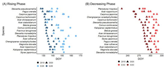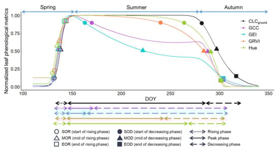- Xie, Y.; Civco, D.L.; Silander, J.A. Species-specific spring and autumn leaf phenology captured by time-lapse digital cameras. Ecosphere 2018, 9, 1–21. [Google Scholar] [CrossRef]