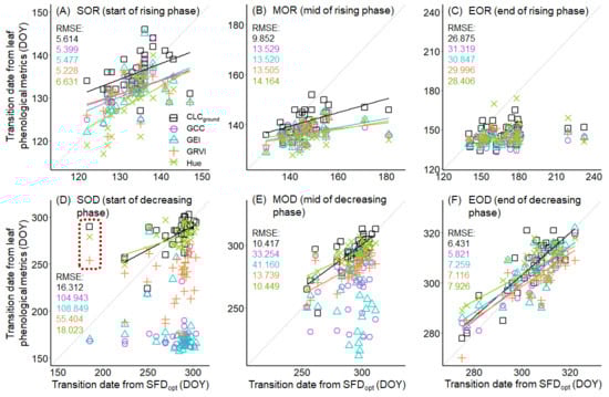 - Toomey, M.; Friedl, M.A.; Frolking, S.; Hufkens, K.; Klosterman, S.; Sonnentag, O.; Baldocchi, D.D.; Bernacchi, C.J.; Biraud, S.C.; Bohrer, G.; et al. Greenness indices from digital cameras predict the timing and seasonal dynamics of canopy-scale photosynthesis. Ecol. Appl. 2015, 25, 99–115. [Google Scholar] [CrossRef]