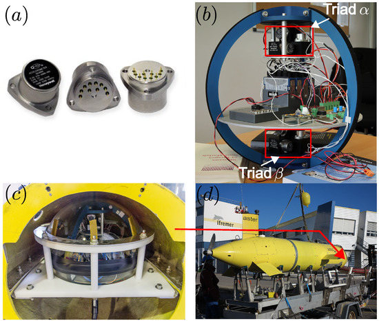 (a) QFLEX QA-3000 electrostatic accelerometers manufactured by Honeywell. (b) Picture showing GraviMob’s accelerometer sensor and its 24 bit digitiser. The two triads and each consisted of 3 accelerometers, the axes of which are mutually orthogonal and are shown in the red boxes. (c) Picture showing the glass sphere mounted in its frame itself screw-fixed into the AUV’s front case. (d) Overall view of AUV Aster. The red arrow points to the front case where the sensor was installed.