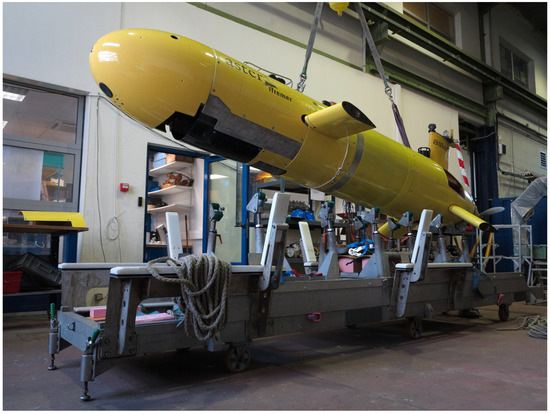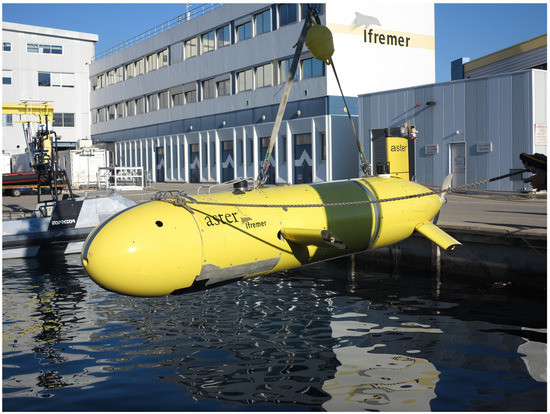 View of IFREMER’s AUV Aster. This submersible is 4.5 m long, 2.1 m wide (fins included) and 0.71 m in diameter with a total mass of 850 kg. It is powered by 50V/16kWh Li-ion batteries. Its autonomy is about 16 h. The maximum immersion depth of Aster is 2650 m.