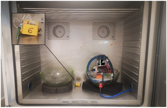 Figure 4. View of the GraviMob system inside the climate chamber. The thumbnail shows an enlarged view of the additional electronic thermometer used for monitoring temperature variations inside the chamber. - setting a temperature set point and recording the voltages delivered by the six accelerometers measuring specific force components and internal temperatures for 5 min, after stabilisation of the internal chamber temperature;