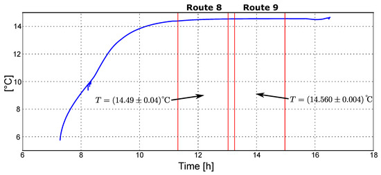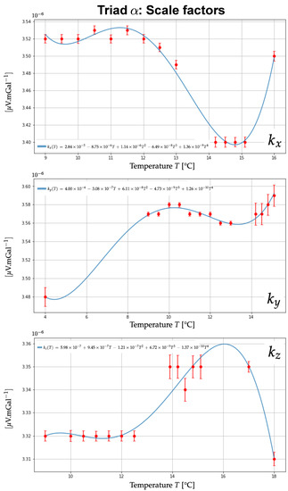 The first step was to calibrate the seven temperature sensors of the GraviMob system. The desired temperature range was set from 4 °C to 21 °C to include the deep water temperatures found in the Atlantic Ocean (4 °C) and the Mediterranean Sea ( °C). At a rate of one recording every 0.5 s (2 Hz), this manipulation made it possible to obtain 600 voltages per temperature for 14 different orientations of the GraviMob system. It thus became possible to obtain 600 estimates of each of the 11 internal parameters (3 scale factors, 5 misalignment components, 3 biases) for a given temperature. The value of each parameter was then determined by averaging these 600 measurements. The standard deviation of the mean was then obtained by dividing the empirical standard deviation of the 600 measurements by the square root of 600 (≈24). The estimates of GraviMob’s internal parameters obtained by this method are presented in Figure 5, Figure 6 and Figure 7. In order to obtain mathematical functions describing the variation of these parameters with temperature, polynomial fits were performed and validated by means of chi-squared statistical tests. Our own results confirm the strong variations of the parameters with temperature, which make it essential to calibrate the system in temperature beforehand. The values of the parameters must then be set according to the mathematical model based on the working temperature of the GraviMob system measured inside the sphere.