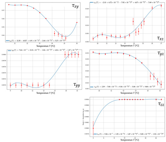Graphs showing the variation of the parameters (top left), (middle left), (top right), (middle right) and (bottom right) arranged as in the matrix (A15) with temperature for the triad . The red solid circles correspond to the values of the parameters determined by our adjustment method and are plotted with their 1 sigma error bars. The blue curves represent the result of a polynomial fit with fourth-degree polynomials. Expressions of the polynomials are directly written out on the graphs. For all three polynomial fits, the coefficient of determination was found to be 0.988 (), 0.899 (), 0.975 (), 0.989 () and 0.997 (). These coefficients did not show a significant increase for polynomial models of degrees greater than 4. The polynomial fits were validated by performing a chi-squared statistical test on the residuals with a 5% risk. This validation required the rejection of some observations that led to the failure of the chi-squared test. The same graphs are available for the triad .