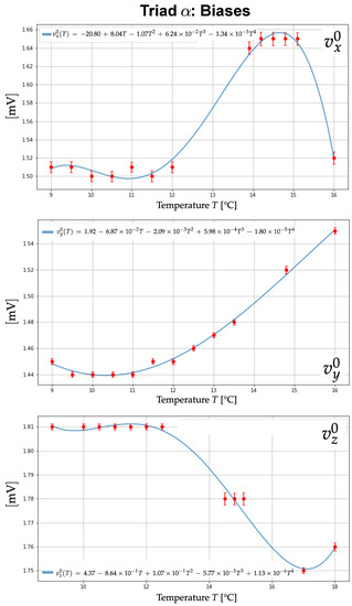 Graphs showing the variation of the accelerometer biases (top), (middle) and (bottom) with temperature for the triad . The red solid circles correspond to the values of the biases determined by our adjustment method and are plotted with their 1 sigma error bars. The blue curves represent the result of a polynomial fit with fourth-degree polynomials. Expressions of the polynomials are directly written out on the graphs. For all three polynomial fits, the coefficient of determination was found to be 0.993 (), 0.996 () and 0.989 (). These coefficients did not show a significant increase for polynomial models of degrees greater than 4. The polynomial fits were validated by performing a chi-squared statistical test on the residuals with a 5% risk. This validation required the rejection of some observations that led to the failure of the chi-squared test. The same graphs are available for the triad .