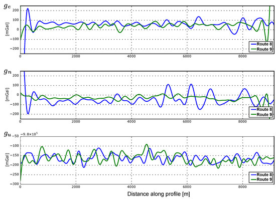 According to the inequality (18) and given the level of noise of GraviMob accelerometers at , the term can be neglected in Equations (16) and (17). Once the term has been removed, Equation (16) (resp. (17)) is the desired gravity (resp. gravitational acceleration) observation equation: