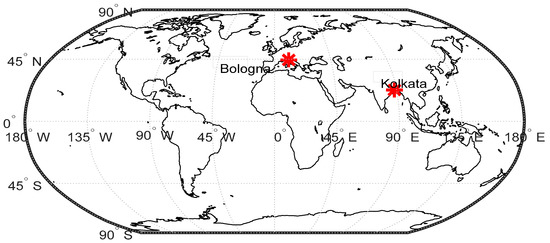 The rain DSD information is retrieved by two optical laser-based disdrometers OTT-Parsivel2, installed at the Department of Physics and Astronomy “Augusto Righi” of the University of Bologna (Bologna, Italy, 44.49°N, 11.34°E, 65 m a.s.l.) and at the Indian Statistical Institute (Kolkata, India, 22.68°N, 88.38°E, 9 m a.s.l.). The study locations of this work are shown in Figure 1. Bologna has a humid subtropical climate with an annual rainfall ranging between 460 and 900 mm.