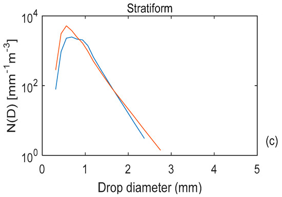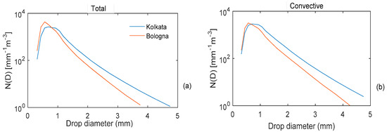 The number concentration was further compared for the two locations separately for the broad categories of rain: convective and stratiform. The DSD for convective rain showed (Figure 2b) almost comparable number concentrations for the small drops (<1 mm) in the two places. Higher population of drops was observed in natural rain of Kolkata for drops greater than 1 mm. Large drops around 5 mm in diameter were noticed in convective rain at Kolkata, whereas Bologna showed large drops approximately around 4.5 mm in diameter. The stratiform rain presented a higher number concentration in Bologna for small and large drops, whereas an abundance of medium-sized drops is noticed in Kolkata (Figure 2c).