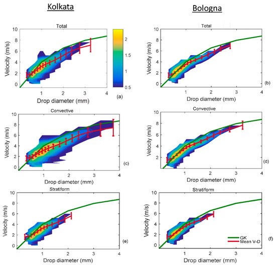 This analysis was performed focusing, first, on the effect of precipitation type on the variation of the V-D relationship. The datasets for both the locations are separated into the two major precipitation types, i.e., convective/stratiform, see Table 1, to study the impact of precipitation type on the super- and sub-terminal drop occurrence. The convective/stratiform separation for Kolkata was performed, minute by minute, based on the empirical relation between N0-R as proposed by [45] for tropical rain, whereas the Bologna database was classified in convective and stratiform rain based on the classification scheme using N0-λ relationship as proposed by [46] for mid-latitude rain.