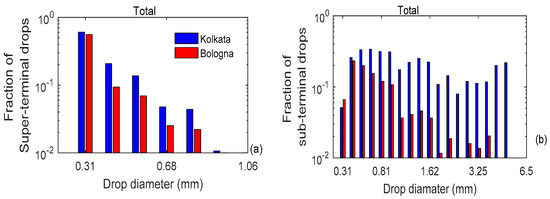 On the other hand, the sub-terminal drops were significant for drops larger than ~0.8 mm in both the locations (Figure 4b), which became lowest around 2.5 mm of diameter and again started increasing. Similar signatures were noticed in the sub-terminal drops for both locations; however, the percentage of sub-terminal drops was higher in Kolkata in comparison with that in Bologna.