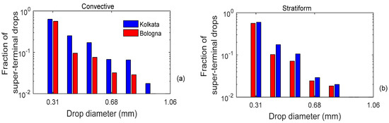 Fraction of super-terminal drops for (a) convective and (b) stratiform rain in Kolkata and Bologna. The fraction of super-terminal drops represents the ratio of these drops and the total number of drops.