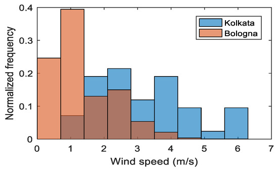 Therefore, it was of valid interest to look at the wind speed during the events considered. Here, wind speed data measured at an interval of 30 min were obtained from the automatic weather station at the Kolkata airport within an aerial distance of 6 km, whereas, in Bologna, the wind measurements were procured with a cup anemometer placed close to the disdrometer, with a 30 min sampling rate.