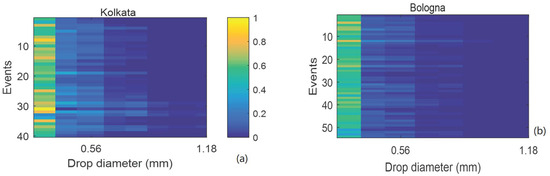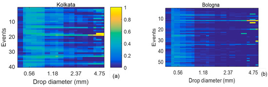 The presence of sub-terminal drops was generally consistent in all events until a drop diameter of 2 mm, after which it varied for the different events. However, the percentage of sub-terminal drops was lower within a drop diameter of 2–3 mm, after which it again started increasing. The variation among the different events was slightly less in Kolkata than in Bologna (Figure 10a).
