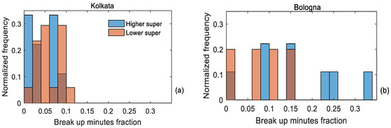 Distribution of the fractions of break-up minutes in events with lower (than average) and higher (than average) percentage of super-terminal drops in (a) Kolkata and (b) Bologna. The break-up minute fraction represents the ratio of the number of break-up minutes with the total rain minutes.