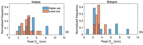 Distribution of the peak Dm in events with a lower (than average) and higher (than average) percentage of sub-terminal drops in (a) Kolkata and (b) Bologna.