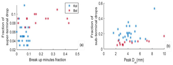 Relation between (a) the break-up minute fraction and fraction of super-terminal drops and (b) peak Dm and fraction of sub-terminal drops in Kolkata and Bologna. The break-up minute fraction represents the ratio of the number of break-up minutes with the total rain minutes.