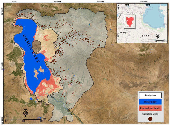 Urmia Lake is a hyper-saline lake in northwestern Iran (Figure 1). The lake has been drying up since 2005 because of the extensive land-use changes, expanding farmlands, human settlements, and industrial activities [13,19]. Urmia Lake Basin (ULB) is a center of agricultural activities, human settlements, and intensive industrial activities. Cities and settlements east of Urmia Lake, such as Tabriz, Azarshahr, Bonab, Maleken, Maraqeh, Ajabshir, Marand, and Shabestar, are surrounded by very productive agricultural farmlands that produce food for the 7.9 million inhabitants living in the ULB. Groundwater has been one of the main drinking water resources for the local population and agricultural activities