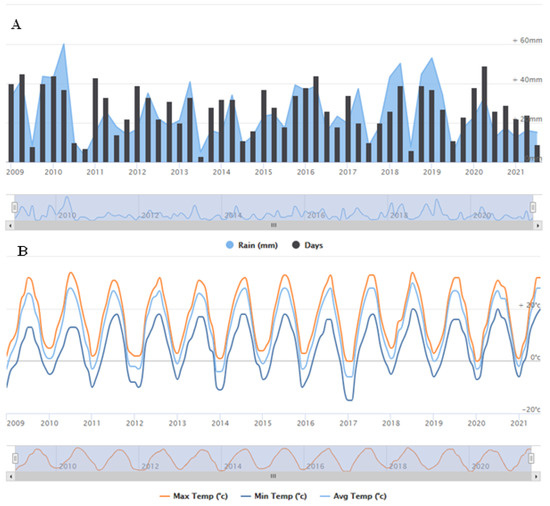Annual precipitation (A) and temperature (B) trend for the ULB From 2009–2021. Annual precipitation in the ULB has been decreasing while the minimum temperatures have increased.