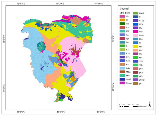 The rather complex geology of the ULB is the result of several tectonic events throughout geological history. The many thermal springs all over the basin attest to the extent of volcanic activity. The metamorphic rocks and Paleozoic platform sediments (a part of the Central Iran zone) north of the lake are bound by the Tabriz-Sofian-Bostan Abad fault to the north and east [40]. The volcanic sedimentary rocks, such as travertine and young traces, which occur extensively in the southeast of the Azarshahr plain, compose the aquifers that yield the primary source of groundwater for agriculture [8]. The Sabalan Volcano (4810 m), consisting of volcanic ash rocks, and the salt domes in Aji Chai are the major geological features in northeastern Azerbaijan, northeast of the Tabriz fault (in the Alborz-Azerbaijan zone). Salt clay is also observed around the lake [8]. Geologically, we can distinguish between unpressurized and pressurized aquifers in the basin. The unpressurized aquifer within the Plio-Pleistocene tuffs on the northern slope of the Sahand is highly developed in terms of water resources [41]. A complete geological map is shown in Figure 4.