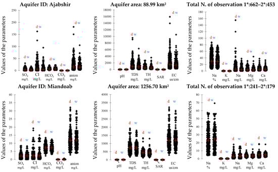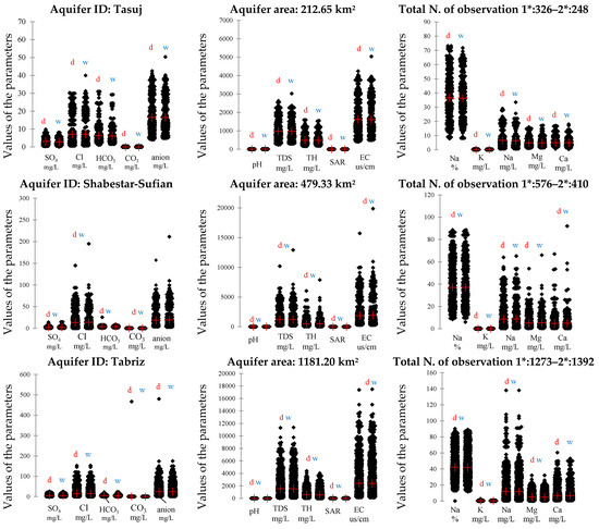 Statistical analysis of the chemical concentrations in the groundwater from nine aquifers on the eastern shore of Lake Urmia. The notation ”d” and “w” refer to the dry and rainy seasons, respectively. Note: SAR, sodium adsorption ratio; TH, total hardness; TDS, total dissolved solids; EC, conductivity.
