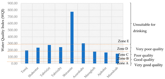 where refers to the relative weight of each parameter and the sum of the weights for this index must be equal to 1; is the weight assigned to each parameter; n is the number of chosen parameters; qi expresses the relative quality of each parameter; Ci is the measured concentration of each parameter in the sample (mg/L); Si is the World Health Organization’s (WHO’s) standard for each parameter (mg/L); and SIi refers to the sub-index of the ith parameter.