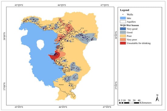 WQI values were computed to assess groundwater quality for drinking purposes in the study area. The average WQI values obtained from the groundwater samples for the two seasons (n = 712) are presented in Figure 6. According to the literature, e.g., [58], the WQI values of potable water are categorized into five water quality classes (Table 1). Our results indicate that in the study area, the groundwater at 199 and 178 sites was good quality for drinking purposes according to WHO standards during the dry and wet seasons, respectively. In contrast, the groundwater at 159 and 176 sites was poor and very poor quality during the dry and wet seasons, respectively. Furthermore, some of the water samples were found to be entirely unsuitable for drinking purposes. Figure 7 and Figure 8 show the groundwater quality index maps for the dry and rainy seasons during the study period, where blue denotes low WQI values and good groundwater quality. The WQI values in the dry season ranged between 31 and 1339.1, with a spatial mean of 152.76. The northern (Tasuj aquifer) and southern (Maragheh and Miandoab aquifers) parts of the study area showed low values, which correspond with relatively good groundwater quality. However, the central parts (Shiramin and Tabriz aquifers) had high WQI values, which indicate poor water quality. The WQI values in the wet season varied between 33.16 and 1024.686, with a spatial mean of 152.87.