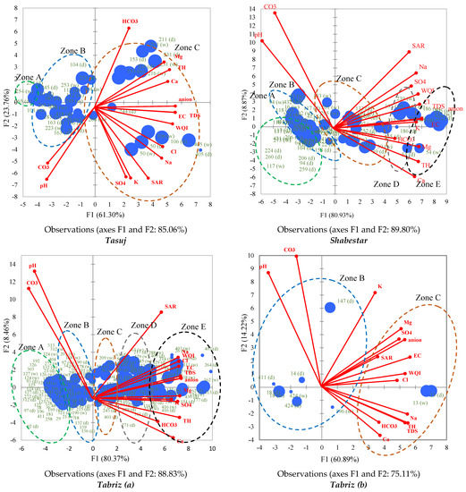 We employed the PCA to reduce fourteen quality variables to two primary components for the Tasuj, Shabestar, Tabriz (a), Azarshahr, Maragheh, Ajabshir ,and Miandoab aquifers and three primary components for the Shiramin and Azarshahr aquifers that could explain over 80% of the total variance in the original dataset. Factor F1 (F1 > 60%) represented groundwater mineralization from SO42−, Cl−, anion, TDS, TH, SAR, EC, K+, Na+, Mg2+, and Ca2+, whereas F2 (F2 > 8.4%) represented groundwater mineralization from HCO3−, CO32−, and pH, all of which affect groundwater quality in the ULB. The association of HCO3−, CO32−, and pH with factor F2 may be attributed to the leaching of bedrock materials and rock-water interaction. The Mg2+ content in groundwater is mostly controlled by rock weathering [27]. A strong positive correlation for K+ (F1 > 0.9) was found in the Shabestar and Tabriz (a) aquifers and was interpreted as the result of contamination caused by the application of chemical fertilizers such as NPK, potash, and manure. K+ in groundwater may also result from the interaction between water and silicates [65].